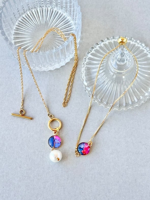 レジンでコーティングしてアクセサリーに仕立てています。